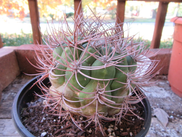I had to bring in the potted plants inside for the winter on October 15 because an “F” was in the forecast. As always, I took photographs and measurements. The Gymnocalycium saglionis did well during the summer and has grown to 2″ tall x 3 3/8″ wide (not including the spines).