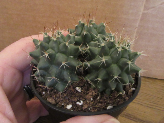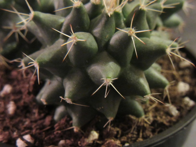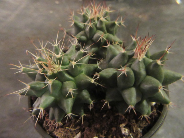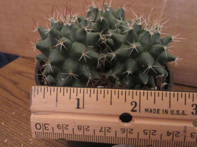 Both the species and this “variant” have a kind of club-shaped to cylindrical growth habit. Information says the species can be bluish-gray while this variety is dark green. The size is somewhat different as well. Mammillaria compressa, according to information online, can grow to about 10″ tall x 4″ in diameter, and this variety grows from 2-8″ tall x 2-3″ or so in diameter. Time will tell…