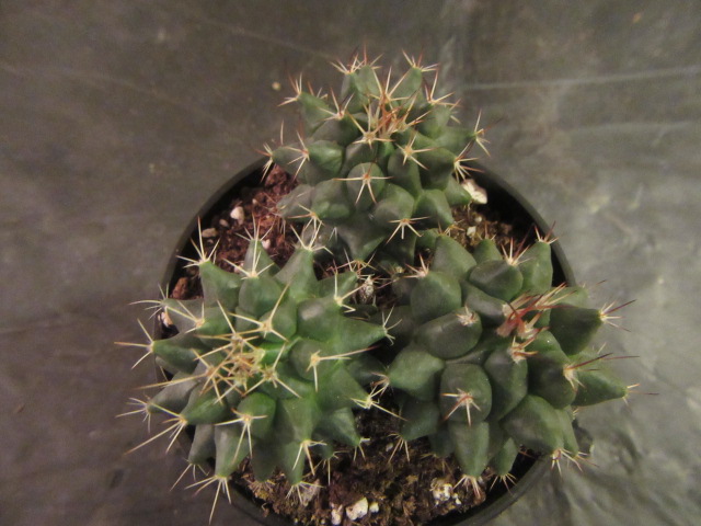 The tubercles of both the species and this variety are very prominent, bluntly angled. pyramidal in shape, and closely set. Even though from areole to areola, on these plants, are fairly far apart. Comparing photos online of the species and this variety, the tubercles on my plants are larger, even though these youngsters are only 1 1/4″ wide x 1 1/2″ tall. In fact, I have 14 or so different Mammillaria species in my collection of cactus, and these have larger tubercles than any of them.