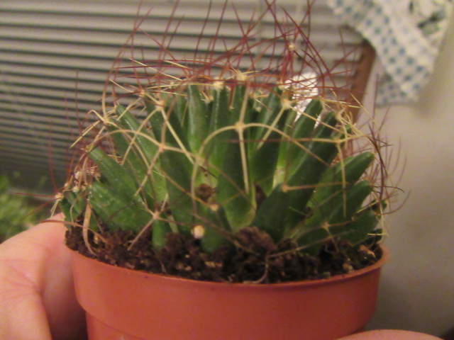 I bought this cactus from Walmart on 3-19-18. It is a very interesting cactus. It’s like the main plant with maybe 5 smaller ones growing on one side. The cluster measures 1 1/2” tall x 3” wide. It has completely filled this 2 3/4” diameter x 2 1/4” tall pot, which is bulging. It has long white radial spines that grow sideways from the tubercles and brown central spines that stick out like stiff hair. Cactus that have protruding tubercles like this one are often called nipple cactus. OUCH!