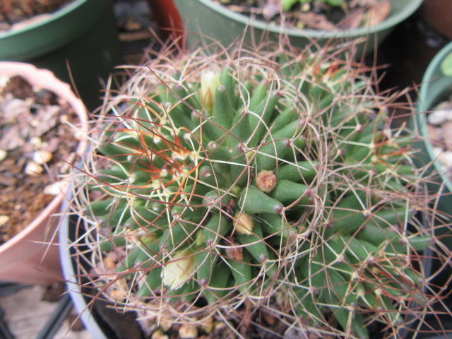Mammillaria decipiens (syn. var. camptotricha) (Bird’s Nest Pincushion) with buds on 6-24-18, #463-5.