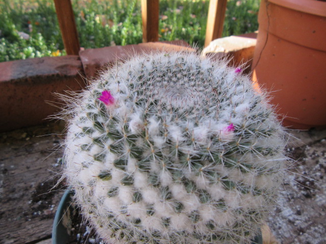 After the “F”, temperatures warmed up for a few days again. This always happens. The cactus were giving me dirty looks so I put them outside for a few days. I noticed the Mammillaria hahniana had a few buds.