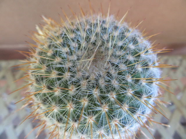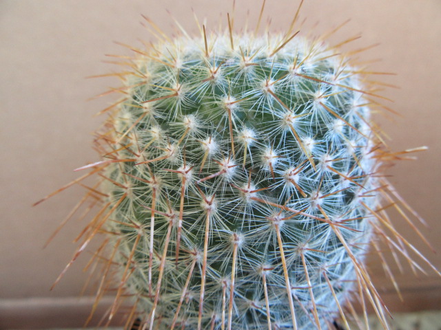 The areoles produce 24-50 very small radial spines that overlap and cover the body of the plant. The lower part of the stem is narrower than the top, on my plant, and is massively covered with radial spines.