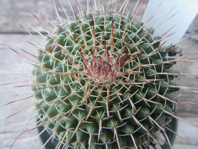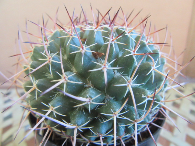 I always like looking at the top of the cactus. The above photo is a good example of how the central spines at the apex of the plant are purplish-brown and change color as the plant grows. The radial spines are a whitish color and much smaller than the central spines. Of course, the spines are very sharp…