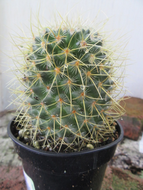 Mammillaria pringlei is one of only a few species that have glowing golden spines. It has 18-22 radial spines and 5-7 central spines that are somewhat re-curved. Information says it is generally a solitary ball cactus that eventually divides dichotomously.