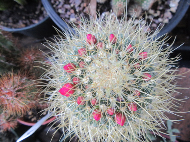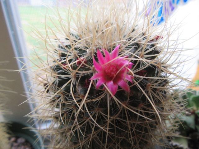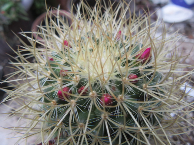 Of course, being a Mammillaria, it is covered with a multitude of tubercles that are arranged in a spiral pattern. The areoles on top of the tubercles produce 18-22 stiff white hair-like radial spines, 5-8 mm in length. Well, I measured them on my cactus and they are around 1/4” long. There are also 5-7 much thicker and longer central spines which is what you really notice about this cactus. The radial spines on my cactus are up to almost 1” long. The lower central spines are more or less straight while the upper ones are more or less recurved. The upper part of the plant has a small amount of wool on the areoles as well as a little in the axils (between the tubercles). I thought there was a big spot of wool on the side of the plant, but it turned out to be a spider web. 🙂