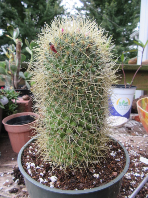 I had to move the potted plants inside for the winter on October 10 because the forecast was calling for an “F” in a few days and the nighttime temperatures were getting cooler. I usually measure the cactus and succulents when I bring them inside. This time the Mammillaria pringlei was 4 7/8″ tall x 2″ wide (without the spines). Last year I screwed up and included the spines when I took measurements. So, with the spines last year it was 4 1/2″ tall x 3 1/2″ wide.