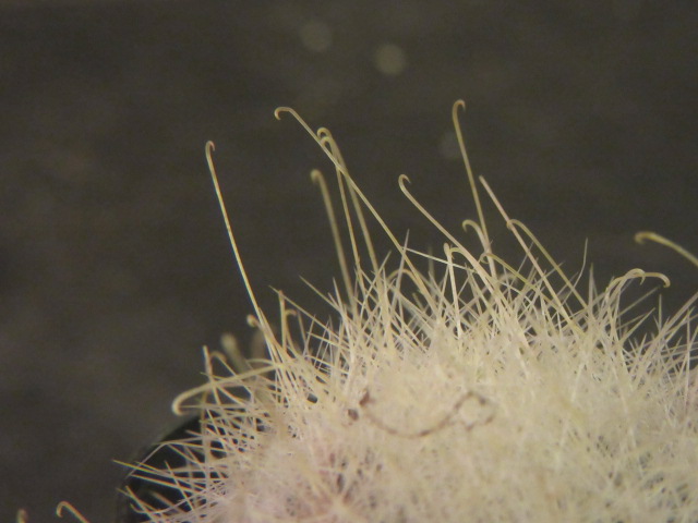 As with all Mammillaria species, it is covered with tubercles that are arranged in a spiral pattern. Areoles on top of the tubercles produce 30-40 very thin radial spines that are, um, 20 mm in length… That’s around 3/4”. My cactus is only 1” tall x 1 1/2” wide and looks very very odd to have such long, thin, hair-like spines. It also has 4-6 white central spines with yellowish tips. The upper and lower central spines have tiny hooks that, in case you are wondering, stick in your fingers. The axils between the tubercles also have wool and bristles, but who can tell?