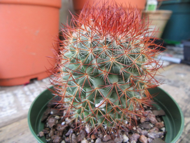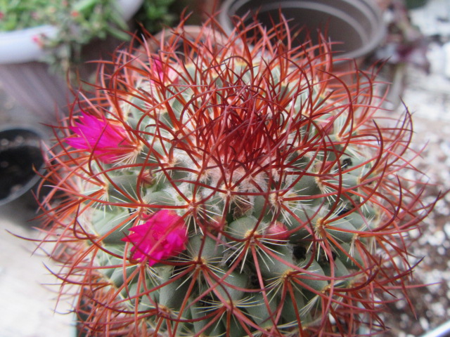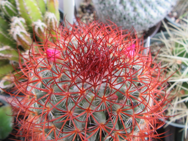 The Mammillaria rhodantha is a very admirable plant with its reddish central spines and white radial spines. It always looks great even without the flowers.