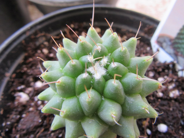 Mammillaria spinosissima ‘Un Pico’ after I bought it home at 1 1/2″ tall x 1 5/8″ wide on 4-3-21, #899-8.
