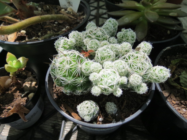 The potted plants made it through the winter and once evening temperatures warmed up I moved the potted plants back outside for the summer. I moved the cactus to the back porch where they could receive full sun. The Mammillaria vetula subsp. gracilis had grown lots of offsets.