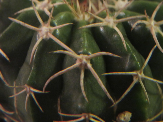 This is one of the smaller growing species of globose-shaped cactus. Mature specimens only grow to about 6-8″ tall (depending on which website you look at). The species grows 10-16 ribs (mine has 13) and has broad, chin-like tubercles between the areoles (Hmmm… That’s what the experts say, but I thought areoles grow on top of the tubercles…). It has 6-14 radial spines that are somewhat appressed and, if there is a central spine present, it points downward. You can actually pick it up without getting stuck. It is normally a solitary growing cactus, meaning it doesn’t normally grow in clusters, BUT sometimes it does. Hmmm…