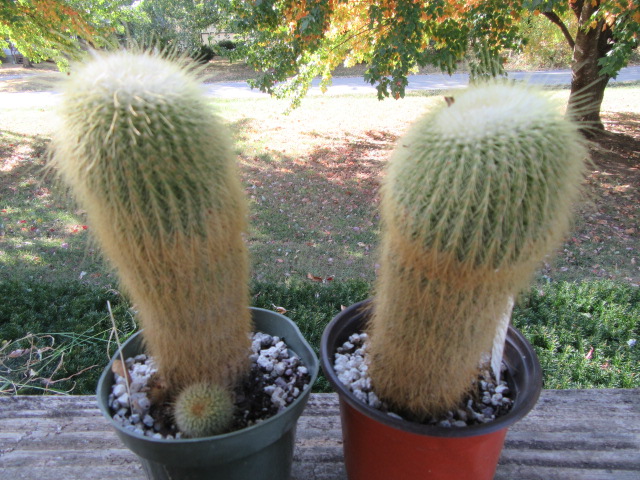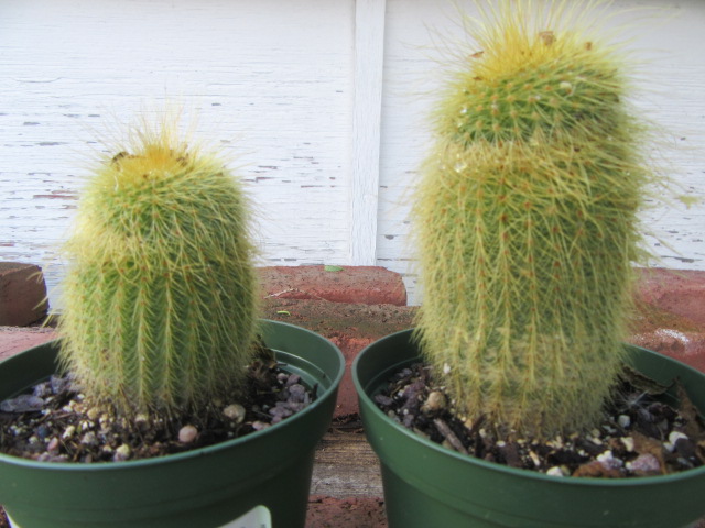 Parodia lenninghausii (Golden Ball Cactus), Greater on the left at 6 1/2″ tall x 2 3/4″ wide, and Lessor on the right at 7″ tall x 2 1/8″ wide on 10-16-22.