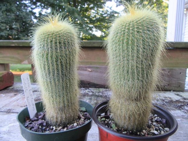 Parodia lenninghausii (Golden Ball Cactus), Lessor (left) at 6 1/2″ tall x 2 3/8″ wide, Greater (right) at 6 1/8″ tall x 2 3/8″ wide on 10-28-21, #853-26.
