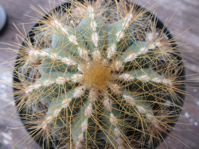 This Parodia magnifica was in an 11 oz. (3 1/2” wide x 3 1/4” tall) pot when I brought it home. The cactus measured approximately 1 3/8″ tall x 2 3/8” wide without the spines at the time. The golden spines on the side of the cactus are approximately 1/2” long and the spines on top are approximately 3/4” long.