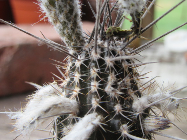 The Echinopsis mirabilis appears to produce one central spine and multiple radial spines from its fuzzy areoles. There are longer spines, approximately 1″ long. on the upper part of the plant. There appear to be 12 columnar ribs on this plant.