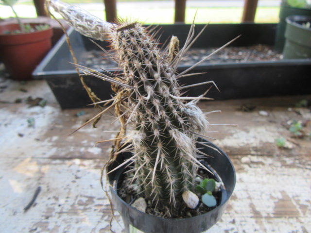 The plant was growing in a 4 oz. (approximately 2 1/2” diameter x 2 1/4” tall) pot. The plant measured approximately 1 1/8” wide x 2 5/8” tall without the spines. It had what appeared to be a side branch with an old flower on the end sticking out of the top.