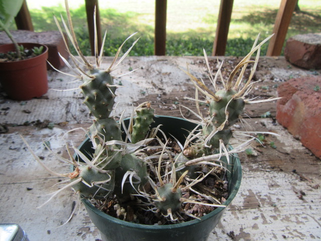 I moved the potted plants back outside the first part of May as temperatures warmed up enough. I keep this Tephrocactus on the front porch with most of the succulents while most of the other cactus are on the back porch. I keep this cactus on the front porch because I don’t want the cats knocking the segments off… It seemed like it got sunburned before, too. They are supposed to do better in full sun and the base of the segments may be thicker so they don’t fall off as easily… Hmmm…