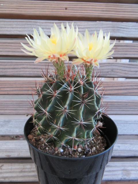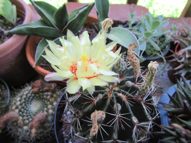 Now for the name issue… Hamatocactus hamatacanthus is a synonym of Ferocactus hamatacanthus, commonly known as the Turks Head Cactus. So, I thought I had a Ferocactus hamatacanthus. However, once the buds opened I became somewhat confused… It has yellow flowers with red centers while Ferocactus hamatacanthus produces flowers that are all yellow… Then an anonymous blog reader suggested Thelocactus setispinus (Miniature Barrel Cactus). After a little research, I think they were correct. I changed the name… I always appreciate help when plants don’t have correct labels… I am no expert.