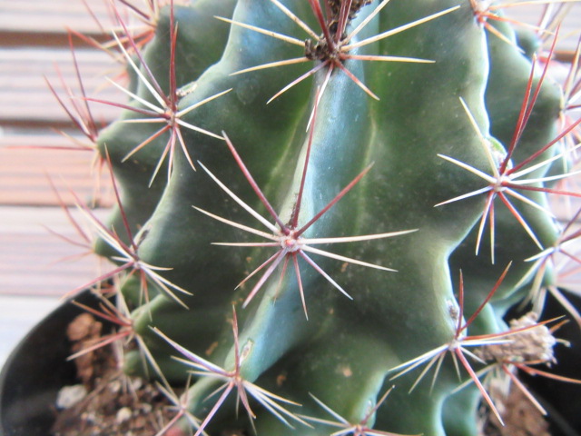 Stems are yellow-green to blue-green in color and have 12-15 thin ribs that are sometimes oblique or twisted. The areoles have 9-17 radial spines and 1-3 central spines.