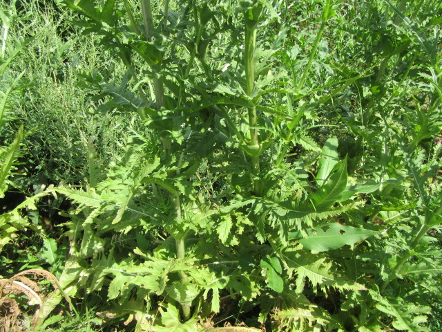 The lanceolate or narrowly ovate leaves grow about 4” wide x 1” long, are pinnately lobed and toothed. Plants do not flower their first season. In the second season, one or more flowering stalks grow from the rosette and reach 2-6 feet tall. The clasping leaves growing from the stems are smaller than the basal leaves. The strong stems can be round or angular, have hooked to straight prickles, and branch out toward the top.