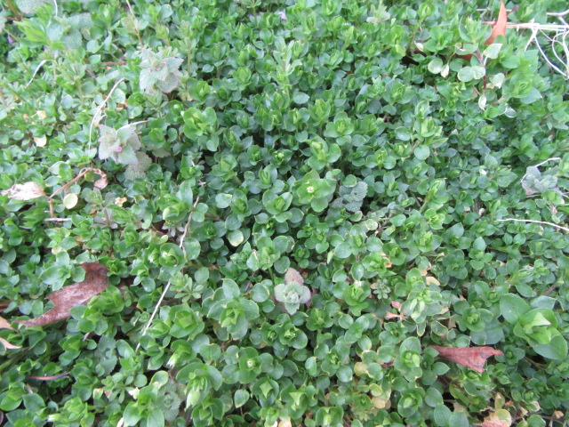The stems are primarily spreading, but they can be more erect if other plants (or foundations) hold them up. Information online suggests the stem grow from 1/2” to 1’ long, branch out at the lower part of the stems, and root at leaf nodes… It seems they can go on forever if you have been in a HUGE colony or have to pull them up in a flower bed. Luckily, they have a shallow root system, but unfortunately, their fibrous roots break and they just keep growing new stems… The stems are normally green, but can also be maroon or burgundy color, and have tiny white hairs in longitudinal lines.