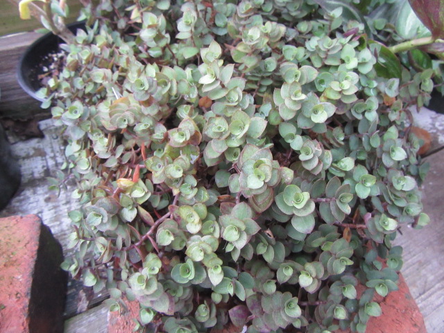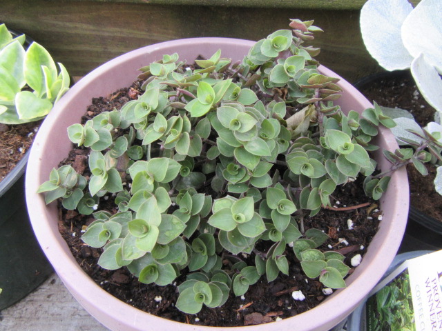 Information says this plant’s stems can grow up to 4′. That may be true if grown in a pot but it could be a different story if grown in the ground. Ummm… Yes, you can grow this plant as a groundcover, or even as a living mulch, among other plants in the ground or in pots in full sun to part shade. Information suggests they grow OK in full sun, but I think that would depend on your climate. I wouldn’t push it… Right now, this plant is on the back porch where it gets pretty much full sun and I am not sure how it would do in full shade. This plant will take root at the leaf nodes if planted in the ground, so saying it will grow to 4′ long could be an underestimate.