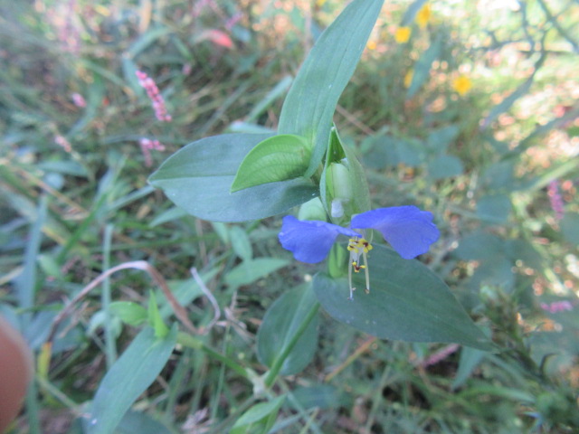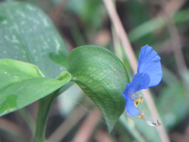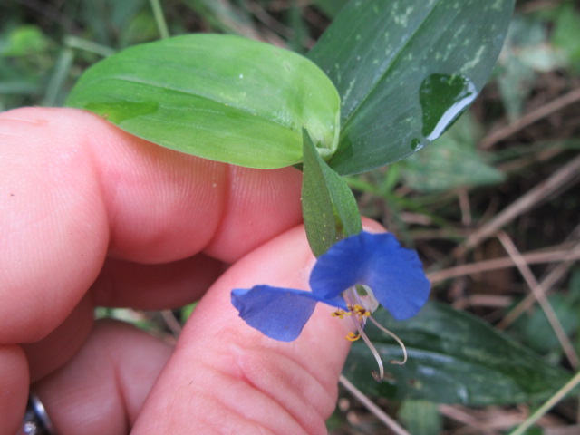Finally, on September 1 as I was leaving the area, I looked down on the left side of where I went in and spotted a few plants with darker blue flowers. I took a closer look and low and behold the sterile anthers had reddish-brown spots. I had found Commelina communis var. ludens! But, something was weird! Their bracts were fused together where they should have been open! I thought maybe I had them backward even though I was sure I knew what I was looking for. After I took several photos, I went back inside to check. Sure enough, Commelina communis are supposed to have open bracts. That is one of the feature characteristics that separate it from C. erecta, besides having the reddish-brown spots. As I said, I screwed up… The spathe-like bracts are CLOSED not NOT fused