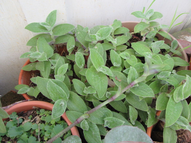 Tradescantia sillamontana on the left and Tradescantia ‘Pale Puma’ on the right on 6-16-19, #591-44..