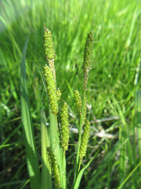 The flowers are somewhat complicated… Each culm produces 1-2 auxiliary spikelets of pistillate flowers along the stem, 1-2 terminal spikelets of pistillate flowers on top of the stem, and one shorter stem that terminates with a single spikelet of staminate flowers. Well, it is A LOT more complicated than that, but that is just the short of it. You can check out the links below for more detailed technical descriptions. Missouri Plants, however, does not have descriptions for this one…