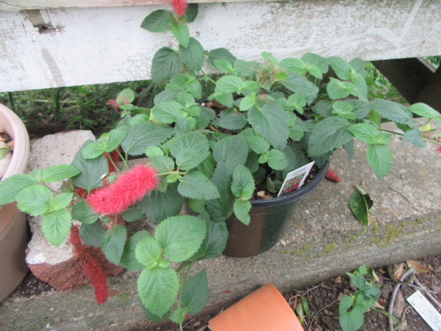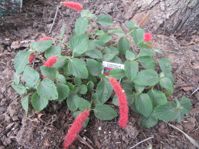 While plant shopping with my sister and niece on May 2, 2018, my sister bought another Chenille Plant for me at Muddy Creek Greenhouse. This year I think I will put it in a larger pot instead of planting it in the ground. Then if I decide to bring it inside for the winter it will already be in a pot.
