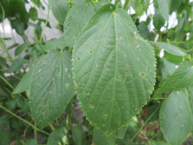The alternate leaves, up to 4” long and 2 1/2” wide and are somewhat thin textured that wilt in the heat. In shape, they are narrowly to broadly ovate or heart-shaped. The base of the leaves can be cordate, rounded, or angled, while the tips are bluntly to sharply pointed. The margins have 18-26 sharp teeth. The upper surface and underside of the leaves are sparsely hairy (pubescent) as are the petioles (leaf stems). The leaves have prominent veins and some have a reddish spot where the petiole attaches below. The leaves turn a coppery color in the fall which is where the name “copperleaf” comes from.