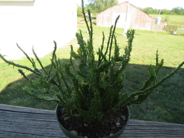 Euphorbia ferox (Thorn Noors/Pincushion Euphorbia) after I brought it home on 5-6-24. The tallest in the pot was 2″ tall. #987-3.