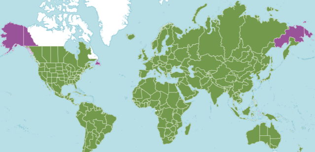 The above distribution map for the genus Euphorbia is from Plants of the World Online. Areas in green are where species in the genus are native and purple is where they have been introduced.