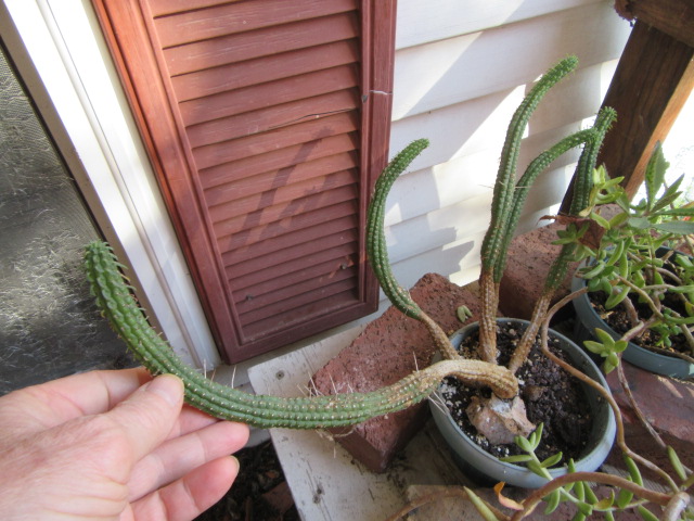 I had to move the potted plants inside on 11-14-24 because there was a frost in the forecast.  They hadn’t received any water for a while which is why some of the cacti shrunk… After a few days, I moved the plants back outside for a while and gave them a good soaking. They like it better outside… I took photos of the Euphorbia mammillaris on 10-24 when the main stem measured 16″ long.