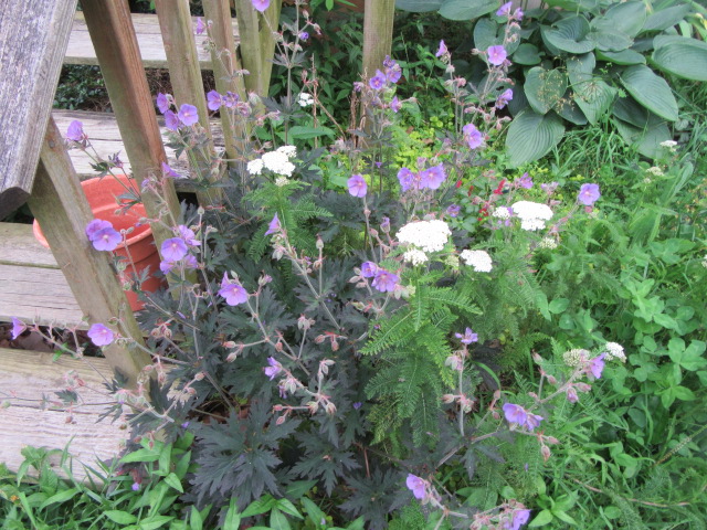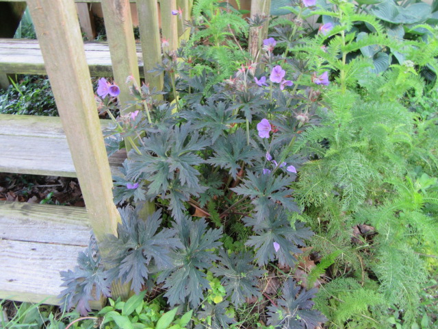 I needed a plant on the right side of the step on the north side of the house so that is where I planted the Geranium pratense ‘Boom Chocolatta’. I had planted a Colocasia ‘Coffee Cup’ here several times, but really wanted something that would return every year without having to over winter a rhizome in the basement. They would always rot and I would have to buy another one. It stays fairly damp over the winter in this location and even perennials I have tried here wouldn’t return the following spring. I was hoping this plant would do the trick…