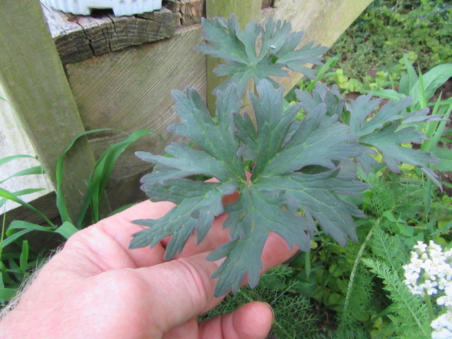 Geranium pratense ‘Boom Chocolatta’ with 8 1/4″ wide leaf on 6-20-25, #1062-5.