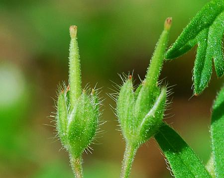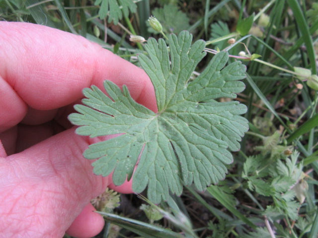 Plants have both basal (attached at the base) and cauline (from the stem) leaves. The leaves, kind of circular in outline, are palmately lobed with 5-9 lobes. These lobes also divided. The leaves are not near as divided as G. carolinianum. The lower leaves have fairly long petioles (leaf stems) that become shorter as they progress up the stem, basal leaves growing in an opposite manner but sometimes upper leaves grow alternate one another. The upper and lower surfaces have short hairs (pubescent).