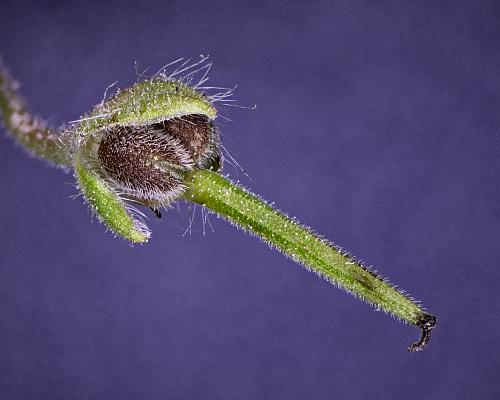 The bisexual (hermaphroditic) flowers are very small and consist of 5 pinkish-purple petals that are kind of wedge-shaped with notched tips. Male parts include 5 fertile stamens with purple anthers and 5 staminodes (infertile stamens). The staminodes may appear scale-like or even be absent. The female parts include a hairy pistol with a superior, 5-lobed ovary, an elongated style, and a stigma with 5 free lobes. The ovary has five fused carpels, each containing two ovules, but usually only one survived to produce a single seed. Surrounding the flower is a sepal with 5 hairy lobes, almost as long as the petals, that taper to a fine point.