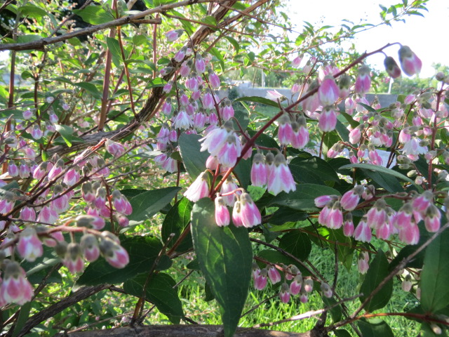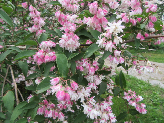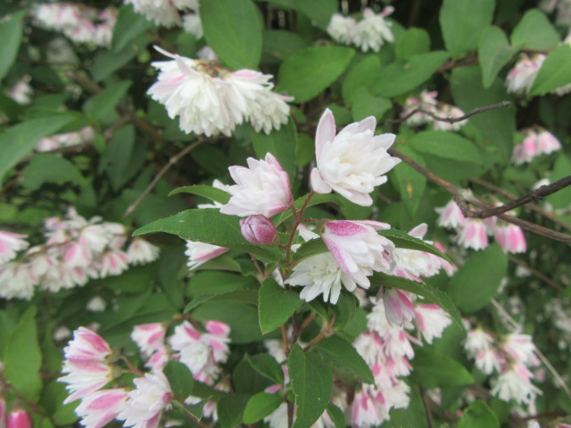 I didn’t know the name of this shrub because I have never encountered it anywhere else. I did online searches and the best I could come up with was that it was an Abelia x grandiflora, which is now a synonym of Linnaea. Even though some of the photos of Abelia/Linnaea flowers did look similar at the time, later when I did research again I didn’t think so. So, I wrote a post about this shrub and a blog reader commented that it was a Deutzia scabra. I think she hit the nail on the head.