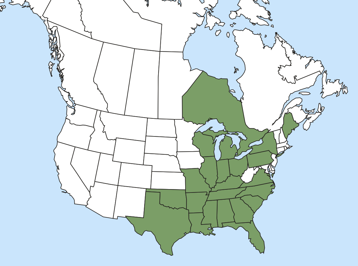 The above distribution map for Sisyrinchium albidum is from Flora of North America. The map on the USDA Plants Database and Plants of the World Online are similar. Areas in green are where the species is native. Most maps are similar but not perfect. They give a pretty good idea of where species are found.