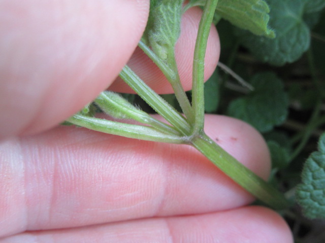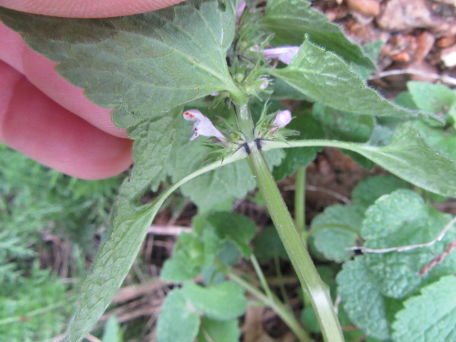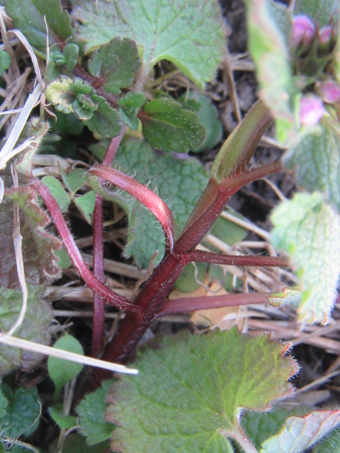 Lamium purpureum grows more upright once they start flowering. Their 4-angled stems (square) are a maroonish color but more green toward the top. Stems usually branch out at the bottom and as the plants grow the lower 1/3 be absent of leaves. As you can see by the above photo, the petioles and stems are “glabrous to slightly pubescent” which means smooth to slightly hairy.