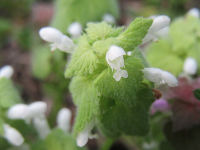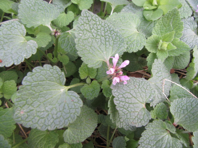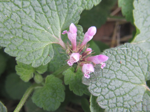 On March 3 (2020) I noticed some of the Lamium amplexicaule and purpureum were beginning to flower. It looks like the flowers are peeking out from under the leaves.