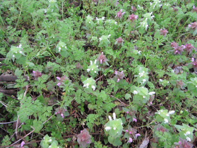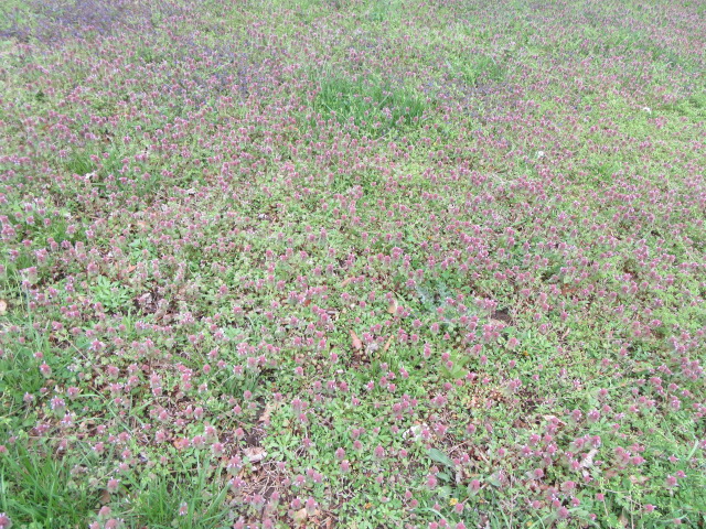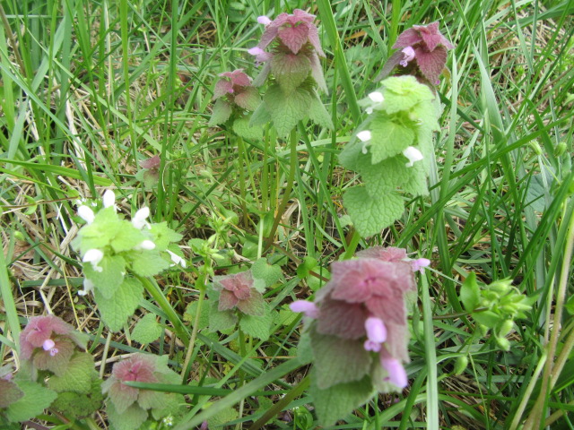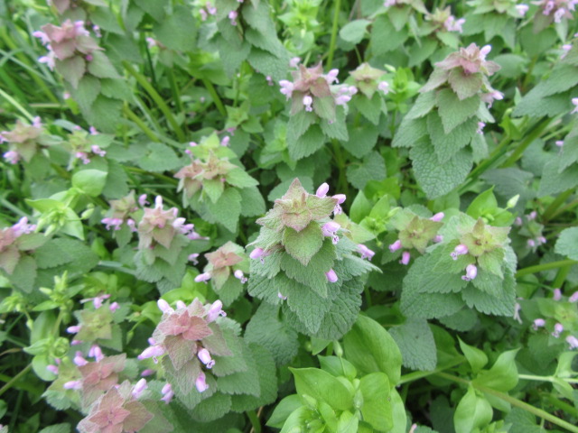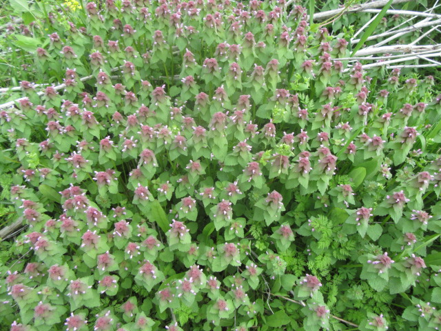 Both Lamium amplexicaule and Lamium purpureum grow in abundance here and there They do very well in areas where the grass is mowed so they can have their way in the spring. Actually, they grow so thick in some areas that the grass doesn’t have a chance.