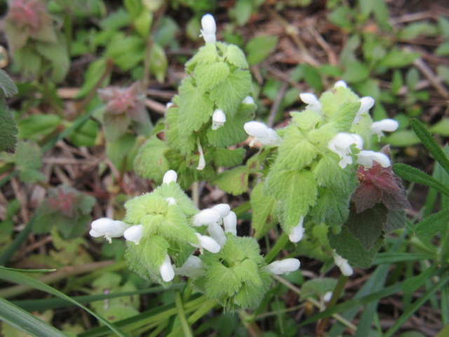THEN, on April 11 when I came back from a walk to the back of the farm, I noticed something weird north of the pond in the small clearing close to the fence. I could hardly believe my eyes! Lamium purpureum with white flowers! I had never seen them here before…