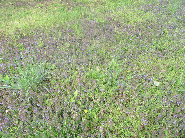 In an area north of the chicken house, east of the garden, the grass doesn’t grow. Early spring in this area comes alive with Lamium amplexicaule, Lamium purpureum, and Glechoma hederacea. They don’t grow well in this spot, but they flower up a storm which leads to more seeds. So, they persist year after year. Once it gets hot, this area becomes a big bare spot.