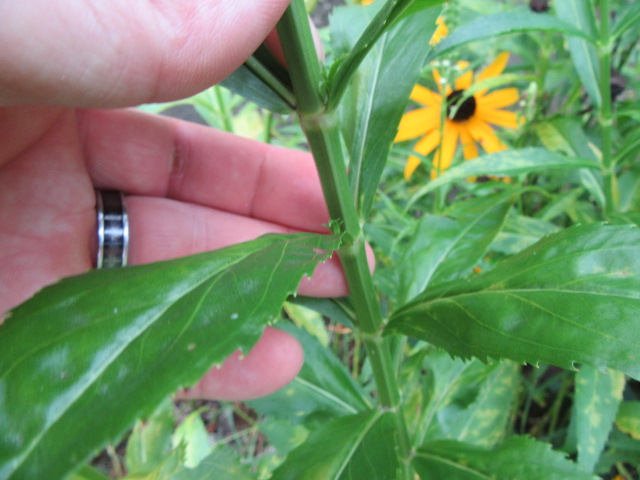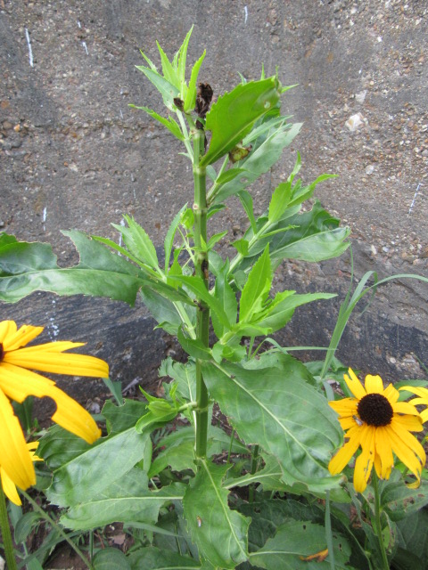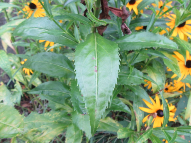 On August 11 the Obedient Plant is blooming up a storm while the Rudbeckia is begging to fade. Some of the upper leaves of the Obedient Plant turn brown and I am not sure why. It almost appears they were burned. I don’t water this bed that often and I rarely get the leaves wet when I do (especially on top).