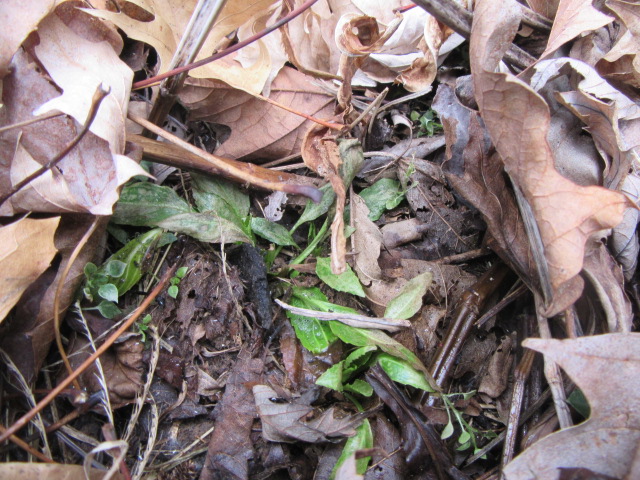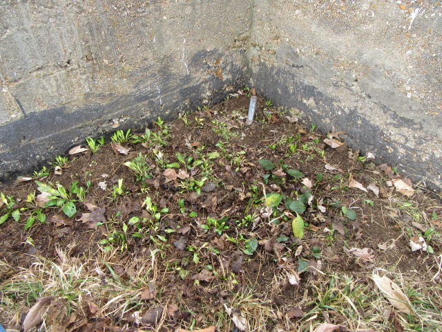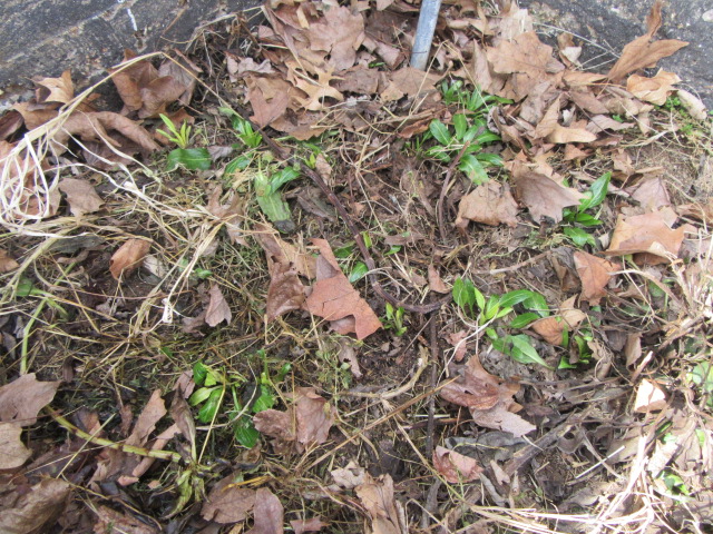 I brushed back the leaves on March 9 and saw what had become of the single plant I put here in 2017.
