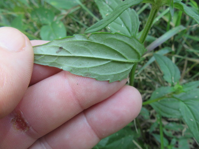 The leaves grow in an opposite manner along the stems and grow up to 2” long by 3/4” wide. The lower leaves have fairly long petioles, while the petioles on the upper leaves are shorter and maybe somewhat winged. The leaves are lanceolate to oblong-ovate and are rounded or tapered at the base. The leaf tips can be angled with rounded or pointed. The leaf margins are usually wavy with fine or irregular blunt teeth. The leaves can be hairless or have fine hairs.