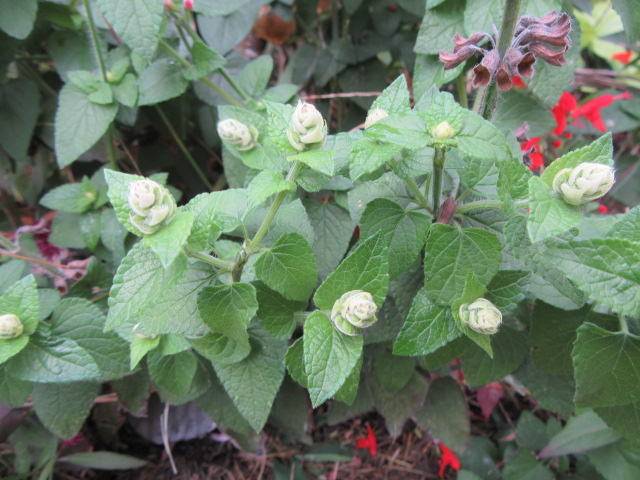 Although the best-known common name is Scarlet Sage, red is not the only flower color. They also come in pink, salmon, orange, and bi-colors. Unfortunately, mine are only red and pink and white bicolor. Some websites say Salvia coccinea doesn’t produce white flowers, but there is a photo of white-flowered plants on Floridata (see link below).